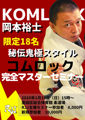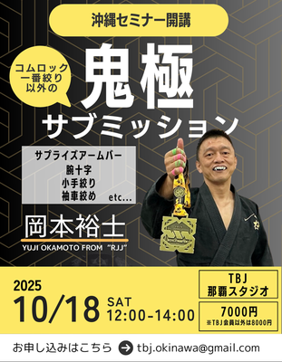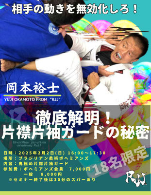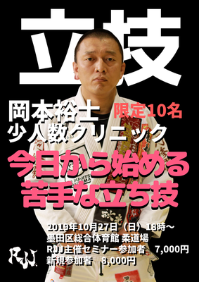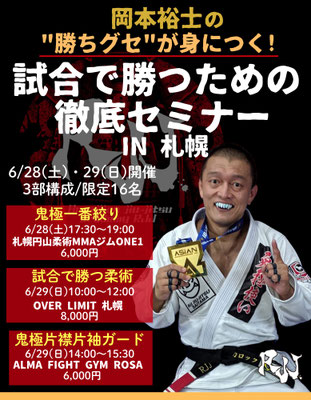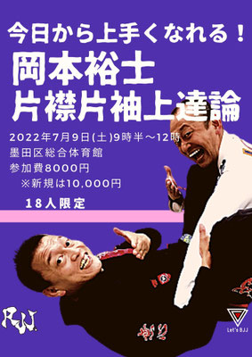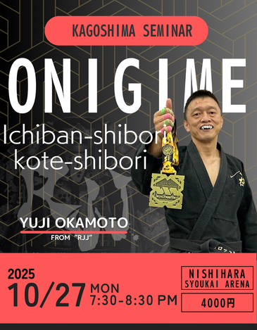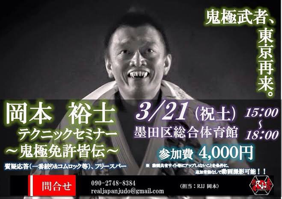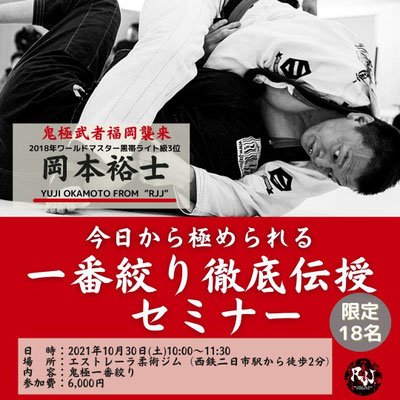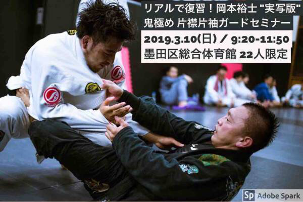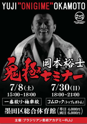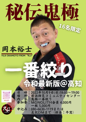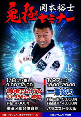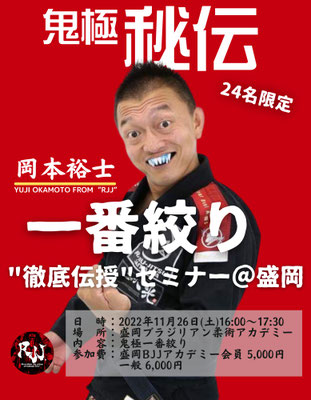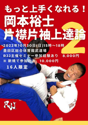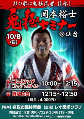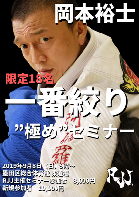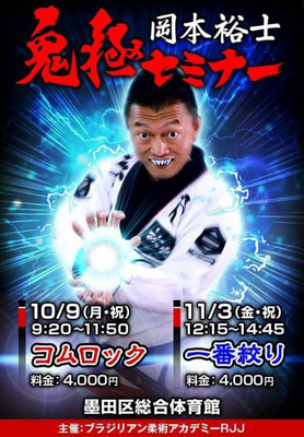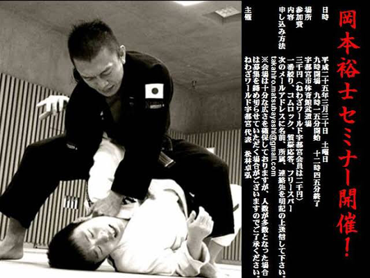 稀代の一本獲りファイター岡本裕士の必殺技(一番絞り、コムロック、片襟片袖ガード等)を直接学べるセミナー。全国各地で行なっております。