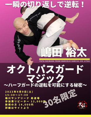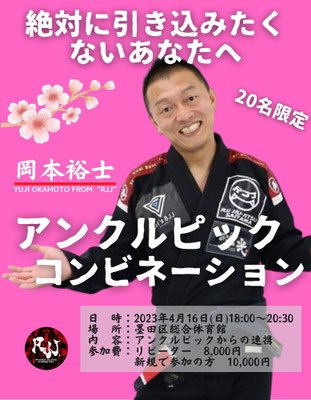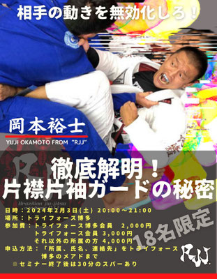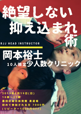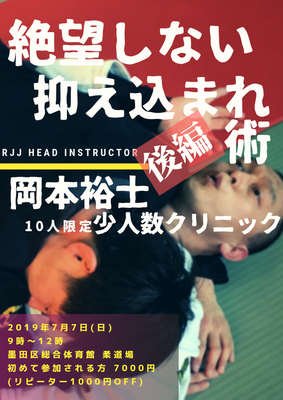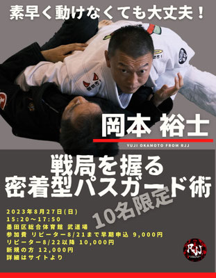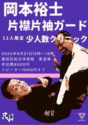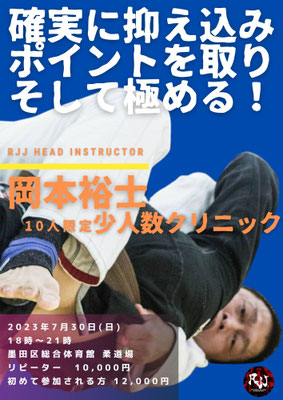 岡本先生による12人限定を基本とした少人数グループレッスン。柔道出身の柔術家、岡本裕士ならではの、一般的なブラジリアン柔術とは角度の違うテクニックを、受講人数を絞ることで、濃密なレクチャーをするクリニック。毎回すぐに売り切れますので、お申し込みは超速で。